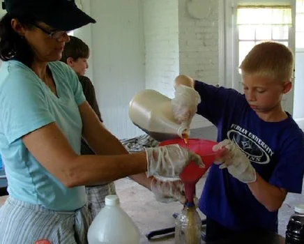 2009. Tawana Weicker and Jeremy Allsbrook, a Polk County Middle School (PCMS) rising seventh grader, filtering his first reclaimed used vegetable oil from a Polk Co. restaurant. Jeremy is now at Polk HIgh and a Biofuels explorer.