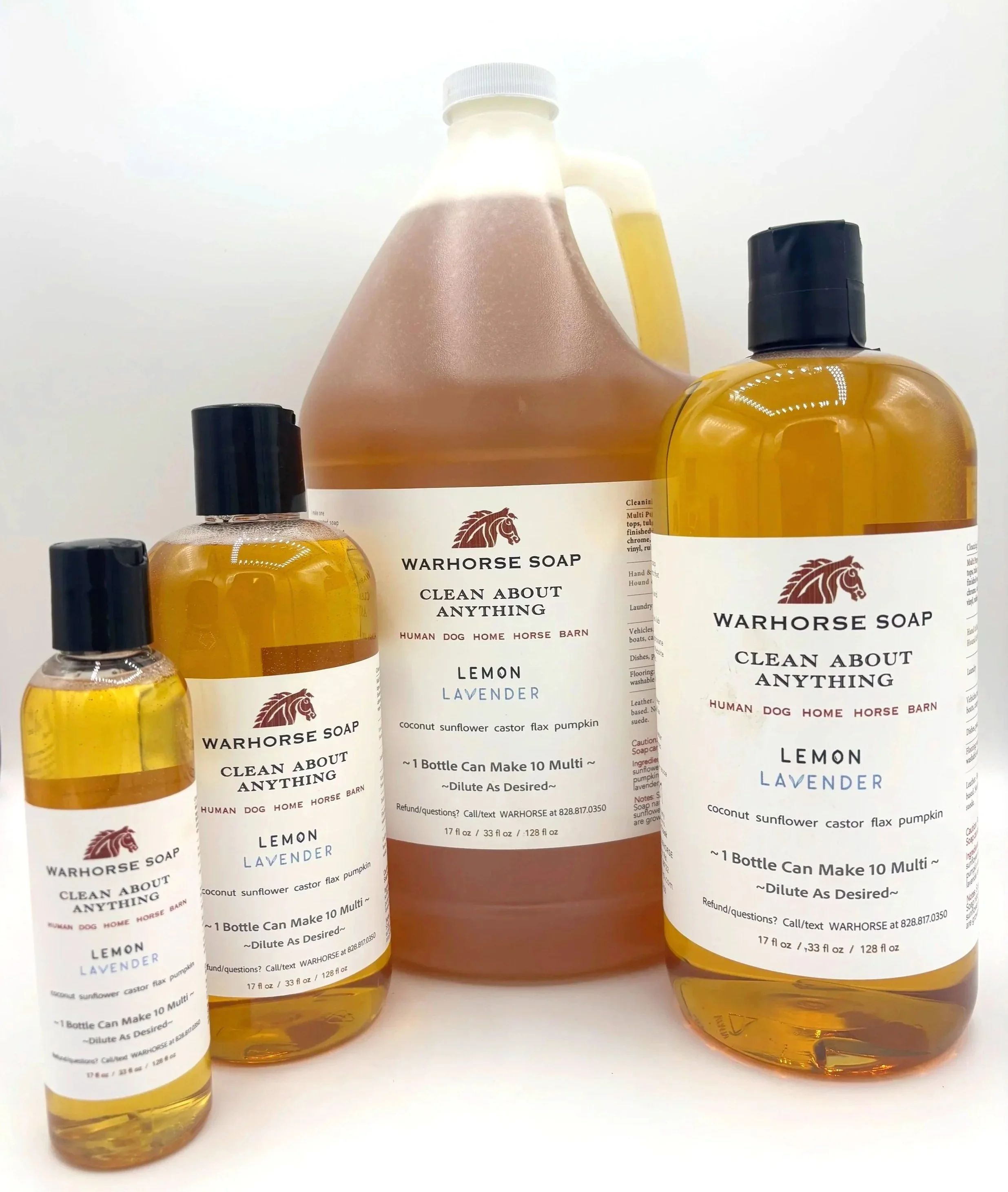 Hand and Body Soap + Concentrated from $18.00 Dog Wash + Concentrate with Sunflower, Pumpkin, Flaxseed. A little cleans a lot. from $18.00 Horse Wash + Concentrate with Sunflower, Pumpkin, Flaxseed. A little cleans a lot. from $28.00 Leather Care Concentrate from $18.00 WARHORSE Multi Clean Anything Soap from $18.00 WARHORSE Human and Hound Wash from $6.00